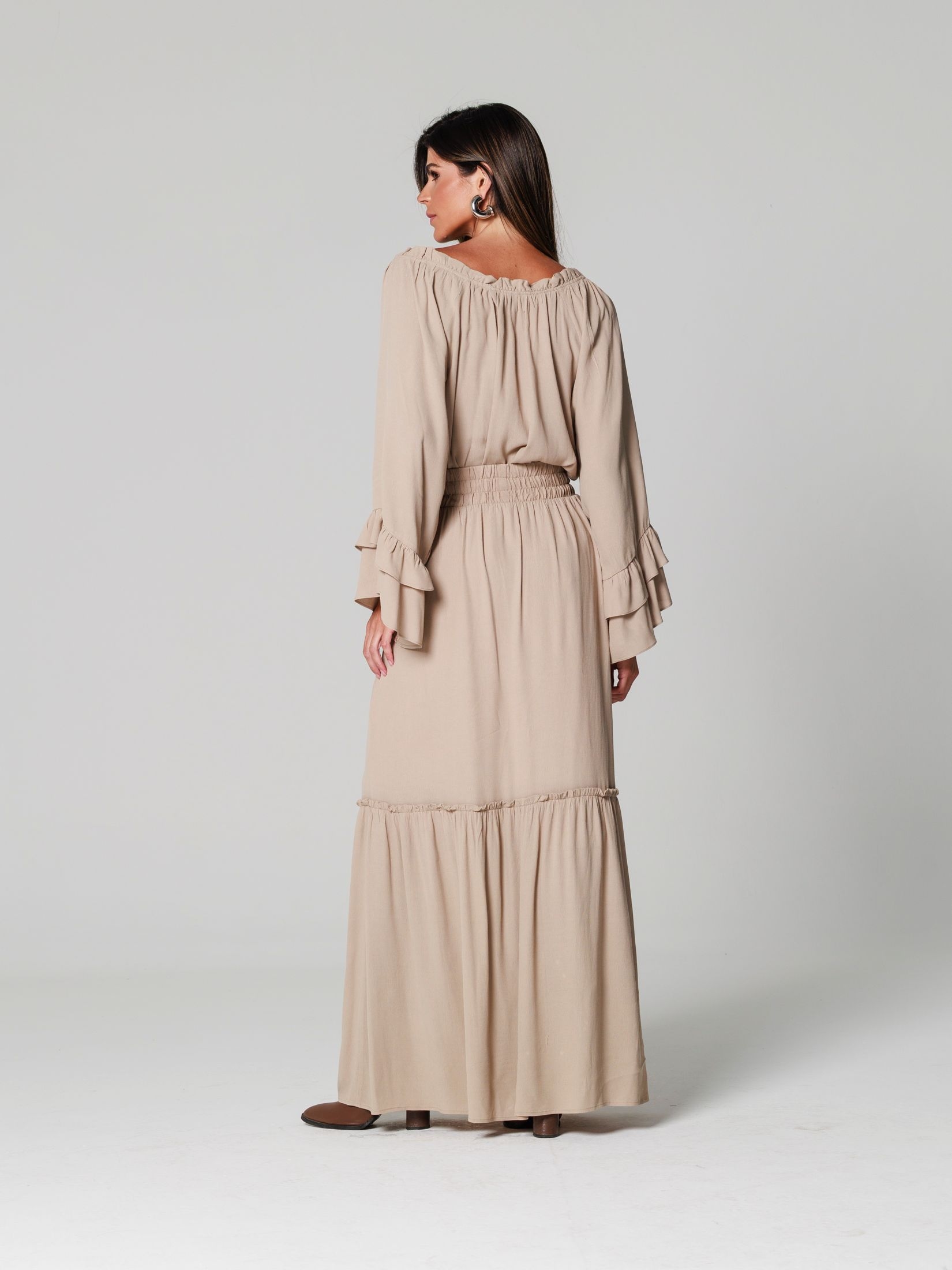 Confeccionada em tecido leve, ela proporciona um caimento impecável, com detalhes refinados que adicionam um toque de sofisticação. As mangas com babados trazem leveza e movimento, conferindo um charme extra ao visual.